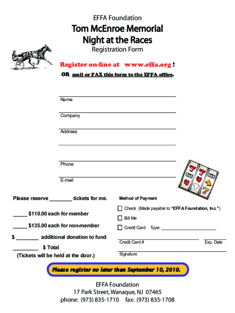 FFA Foundation Tom McEnroe Memorial Night at the Races Registration Form Register online at www.effa.org ! OR mail or FAX this form to the FFA office. Name Company AddressPhone EmailPlease reserve