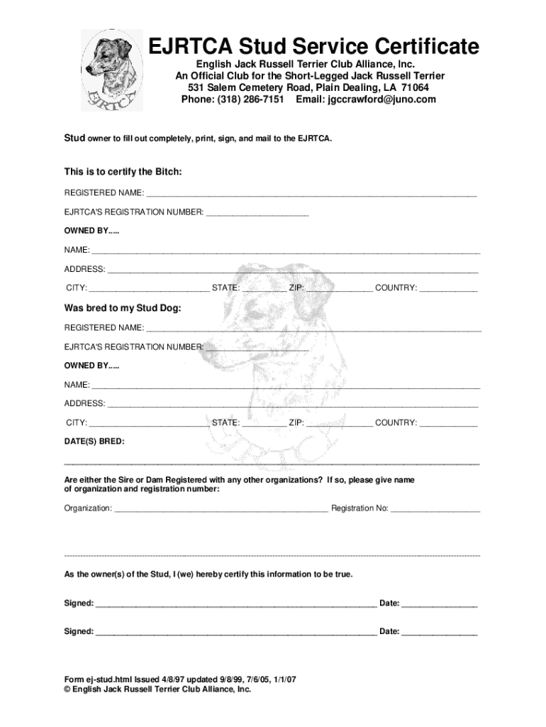 ERICA Stud Service Certificate English Jack Russell Terrier Club Alliance, Inc. An Official Club for the Shortened Jack Russell Terrier 531 Salem Cemetery Road, Plain Dealing, LA 71064 Phone: (318)