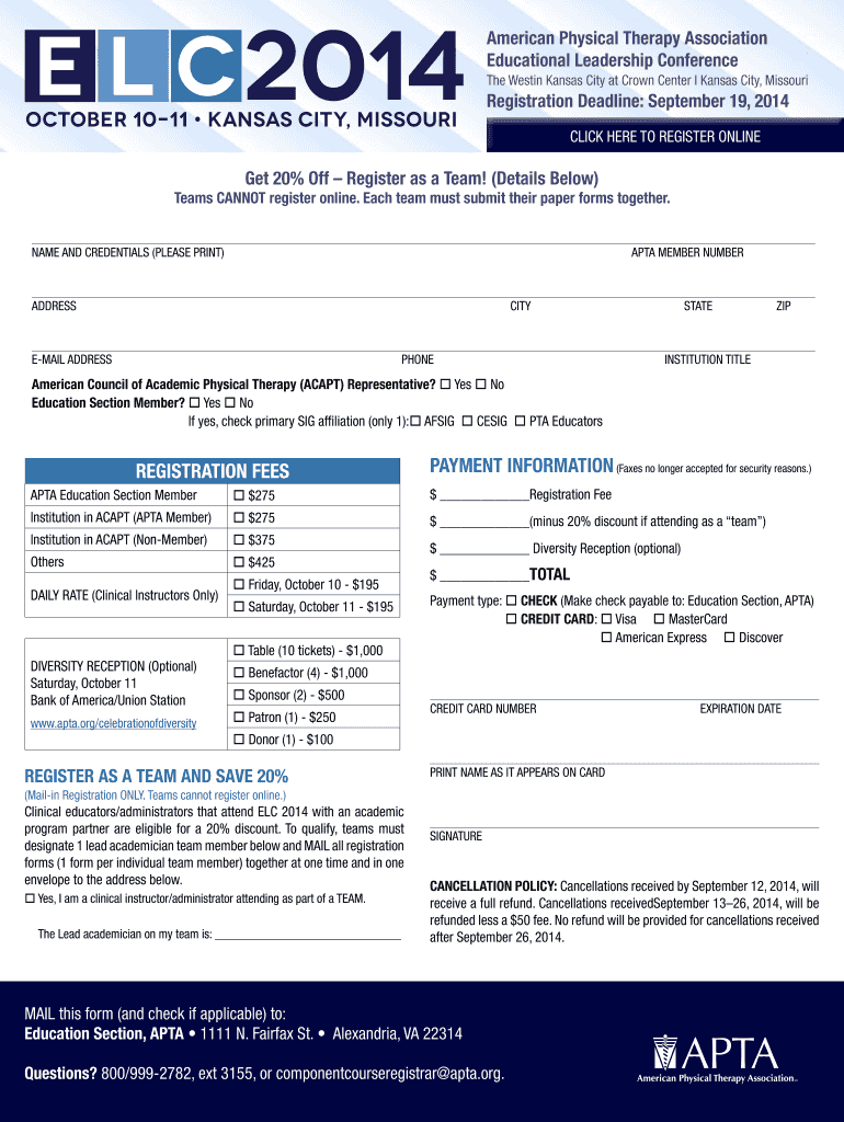 American Physical Therapy Association Educational Leadership Conference The Weston Kansas City at Crown Center l Kansas City, Missouri Registration Deadline: September 19, 2014, CLICK HERE TO REGISTER