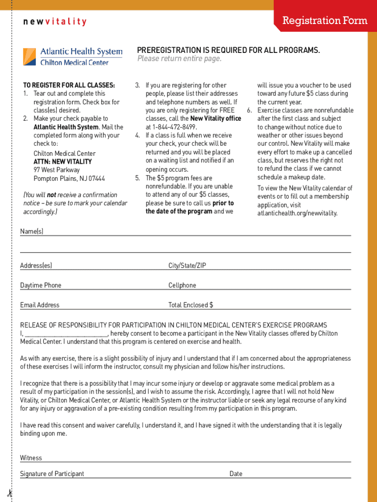 Registration FormnewvitalityPREREGISTRATION IS REQUIRED FOR ALL PROGRAMS. Please return entire page. TO REGISTER FOR ALL CLASSES: 1. Tear out and complete this registration form. Check box for class(BS)