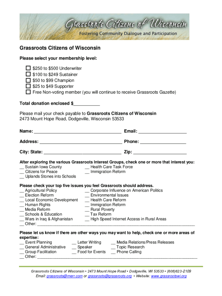 Grassroots Citizens of Wisconsin Please select your membership level: $250 to $500 Underwriter $100 to $249 Sustainer $50 to $99 Champion $25 to $49 Supporter Free Nonvoting member (you will continue
