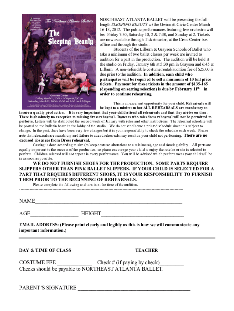 NORTHEAST ATLANTA BALLET will be presenting the full length SLEEPING BEAUTY at the Gwinnett Civic Center March 1618, 2012. The public performances featuring live orchestra will be: Friday 7:30, Saturday
