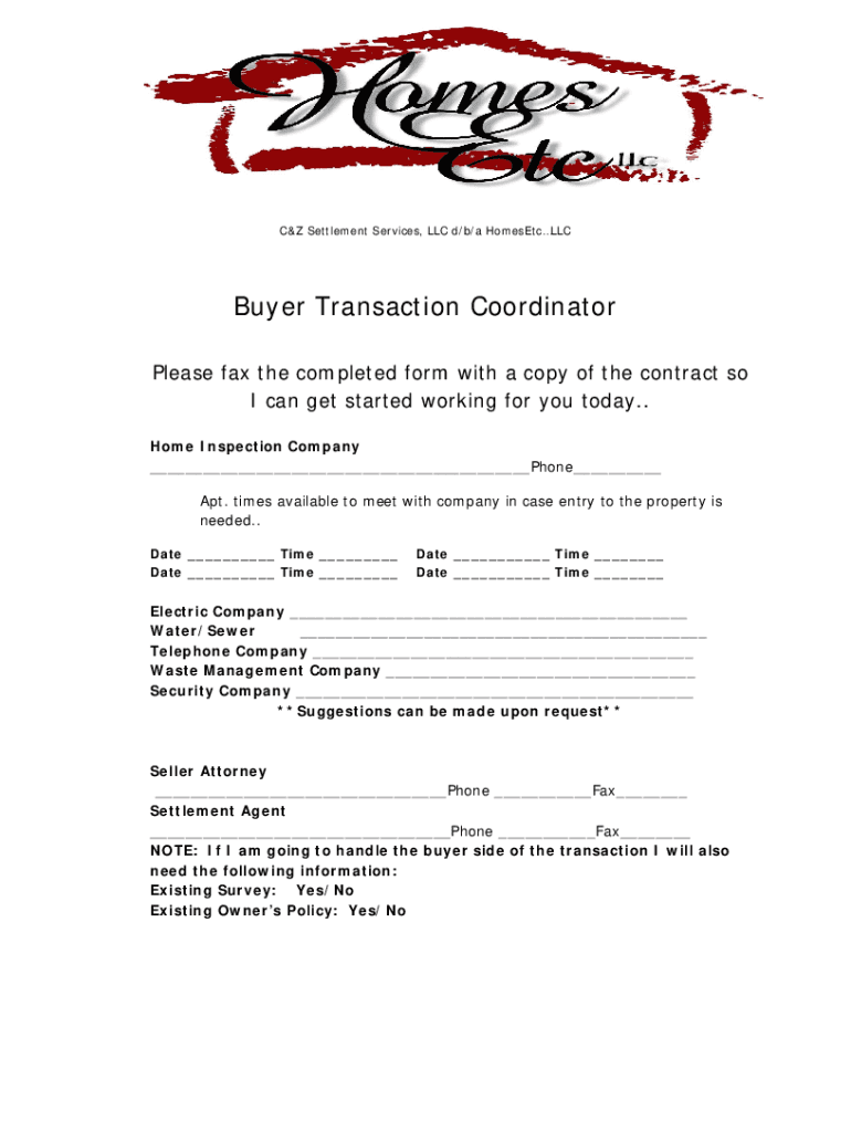 C&Z Settlement Services, LLC d/b/a HomesEtcLLCBuyer Transaction Coordinator Please fax the completed form with a copy of the contract, so I can get started working for you today. Home Inspection Company
