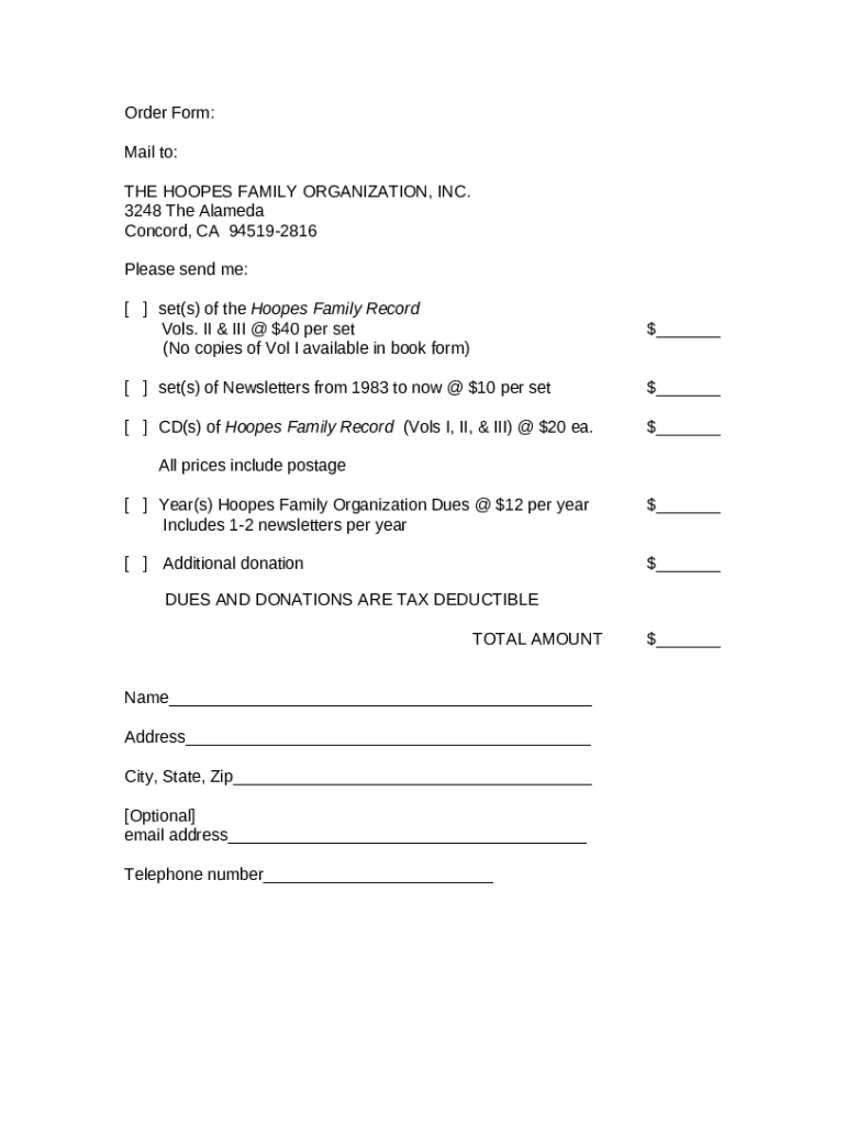 What is Order : - The Official Hoopes Family Organization Website Form?