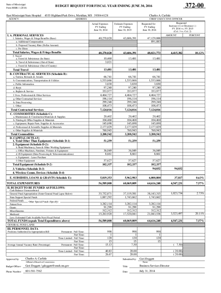 State of Mississippi Form MBR1 (2014)East Mississippi State Hospital37200BUDGET REQUEST FOR FISCAL YEAR ENDING JUNE 30, 2016 4555 Highland Park Drive, Meridian, MS 393044128AGENCYCharles A. CarlisleADDRESSCHIEF