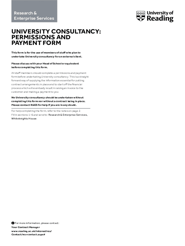Research & Enterprise ServicesUNIVERSITY CONSULTANCY: PERMISSIONS AND PAYMENTFORM This form is for the use of members of staff who plan to undertake University consultancy for an external client.