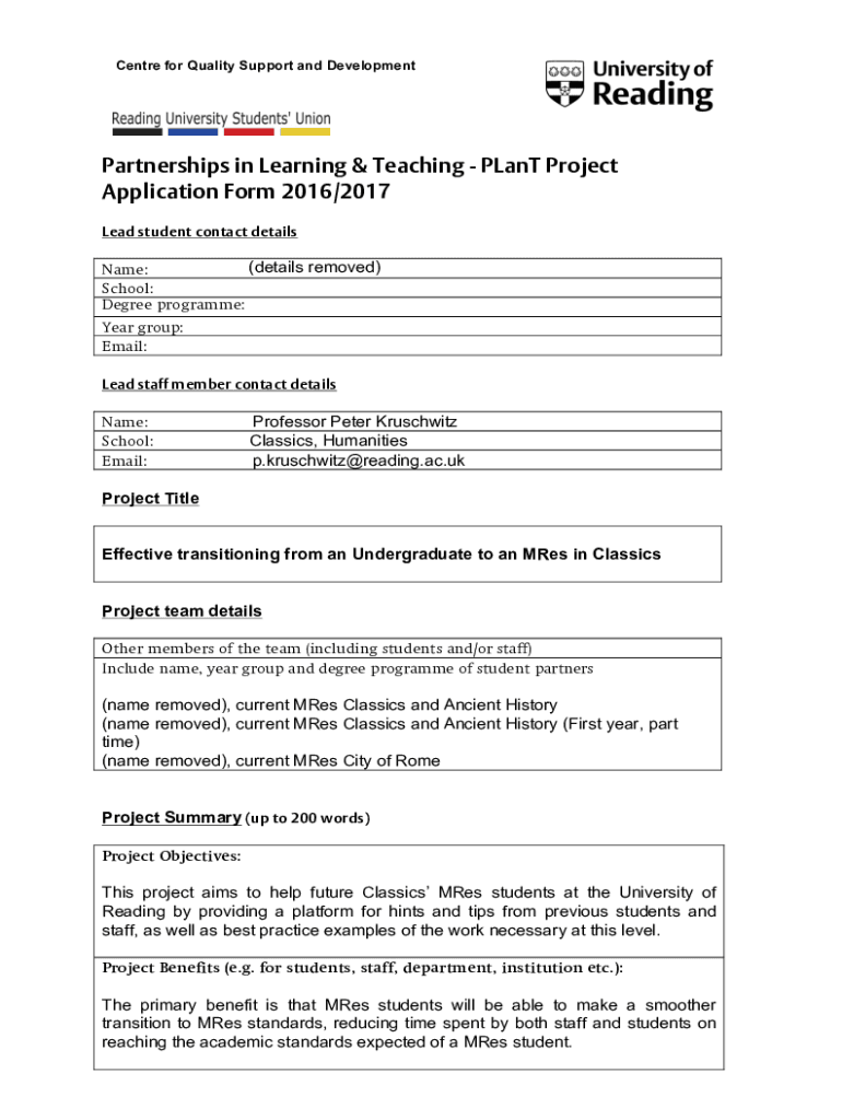 Center for Quality Support and DevelopmentPartnerships in Learning & Teaching Plant Project Application Form 2016/2017 Lead student contact details(details removed) Name: School: Degree program: Year
