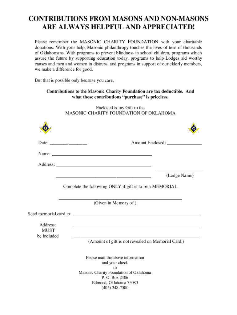 Please remember the MASONIC CHARITY FOUNDATION with your charitable