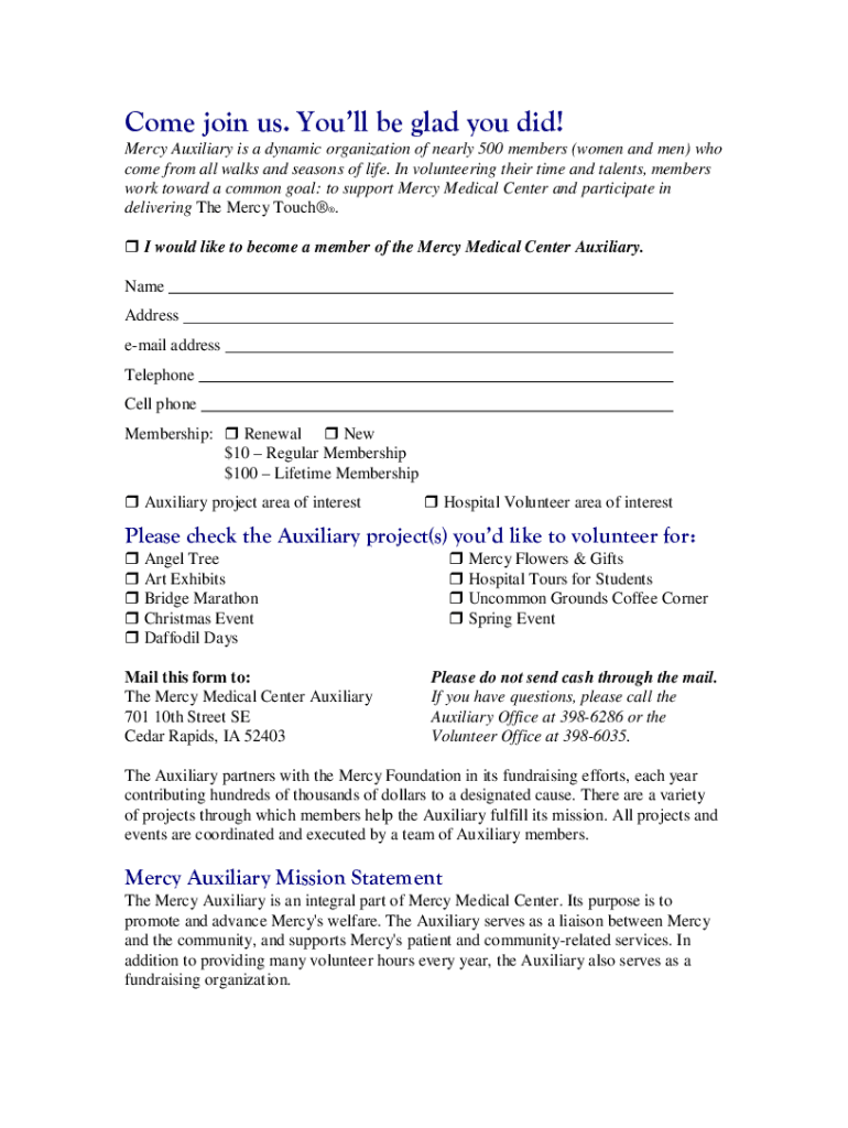 Come join us. You'll be glad you did! Mercy Auxiliary is a dynamic organization of nearly 500 members (women and men) who come from all walks and seasons of life. In volunteering their time and talents,