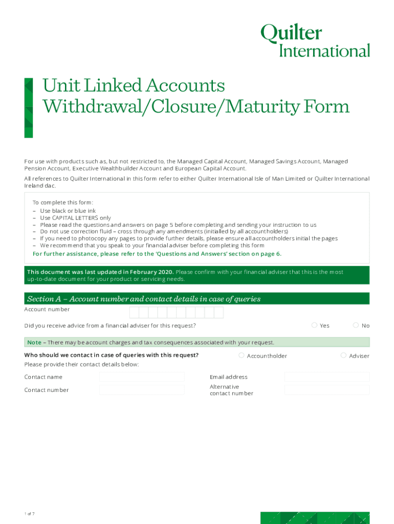 Unit Linked Accounts Withdrawal/Closure/Maturity Form For use with products such as, but not restricted to, the Managed Capital Account, Managed Savings Account, Managed Pension Account, Executive