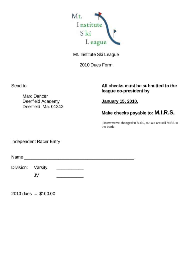 The Institute Ski League is a Word document required to be submitted to the specific address in order to provide specific info. It needs to be filled-out and signed, which can be done in hard copy, or via a certain software such as PDFfiller. It helps to fill out any PDF or Word document directly from your browser (no software requred), customize it depending on your needs and put a legally-binding electronic signature. Right after completion, user can send the Institute Ski League to the relevant person, or multiple ones via email or fax. The blank is printable too thanks to PDFfiller feature and options presented for printing out adjustment. Both in electronic and physical appearance, your form should have a neat and professional look. It's also possible to turn it into a template for further use, without creating a new file again. You need just to amend the ready form.
