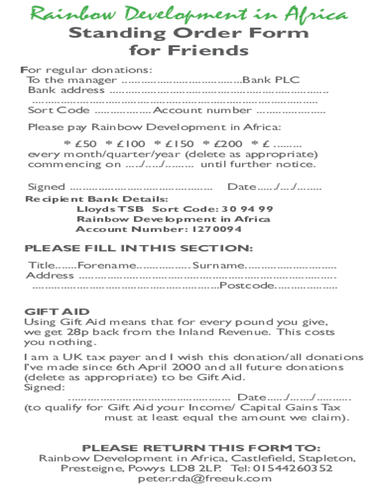 Rainbow Development in Africa Standing Order Form for Friendster regular donations: To the manager ...................................... Bank PLC Bank address .....................................................................