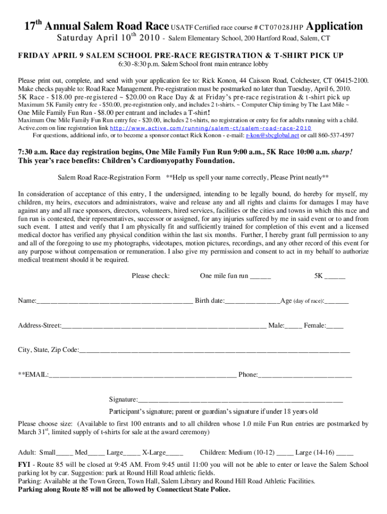 17th Annual Salem Road Race USAF Certified racecourse # CT07028JHP Application Saturday, April 10th 2010 Salem Elementary School, 200 Hartford Road, Salem, FRIDAY, APRIL 9 SALEM SCHOOL PREFACE REGISTRATION