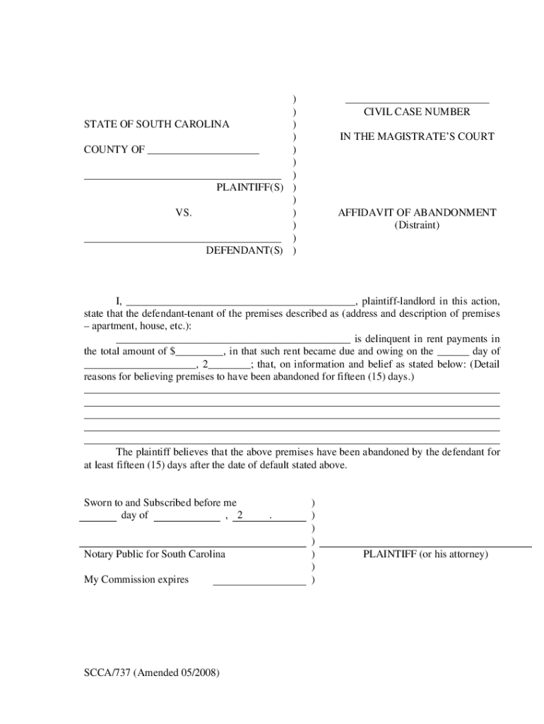 )) STATE OF SOUTH CAROLINA)) COUNTY OF))) PLAINTIFF(S))) VS. ))) DEFENDANT(S)) CIVIL CASE NUMBER IN THE MAGISTRATES COURTAFFIDAVIT OF ABANDONMENT (Distraint)I, plaintiff landlord in this action, state