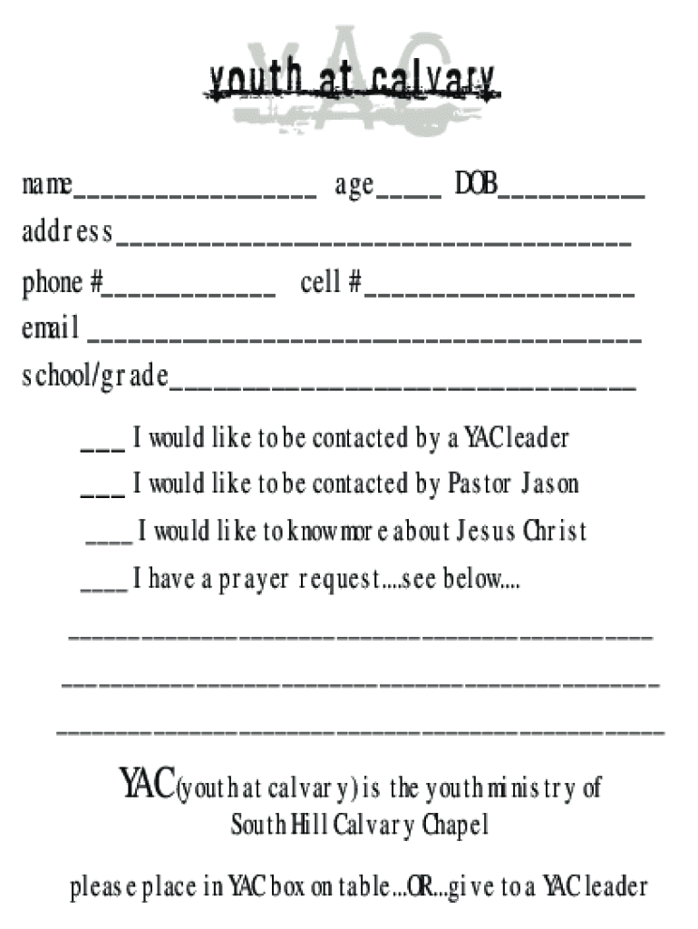 Name age DOB address phone # cell # email school/grade I would like to be contacted by a YAC leader I would like to be contacted by Pastor Jason I would like to know more about Jesus Christ I have
