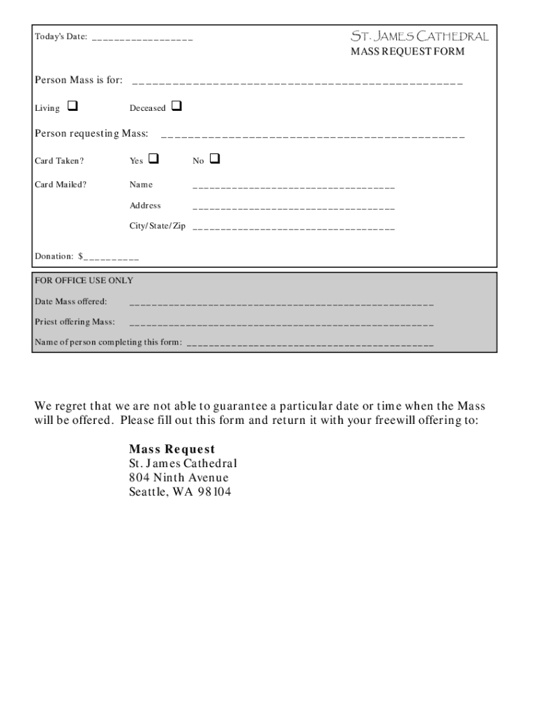 ST. JAMES CATHEDRAL MASS REQUEST FORMTodays Date: Person Mass is for: LivingDeceasedPerson requesting Mass: Board Taken? Discard Mailed? Name Address City/State/Zip Donation: $ FOR OFFICE USE ONLY