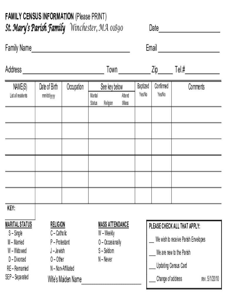 FAMILY CENSUS INFORMATION (Please PRINT) St. Mary's Parish Family Winchester, MA 01890Date Family Name Email Address Town Zip Tel.# NAME(S) List all residentsDate of BirthOccupationmm/dd/Élysée