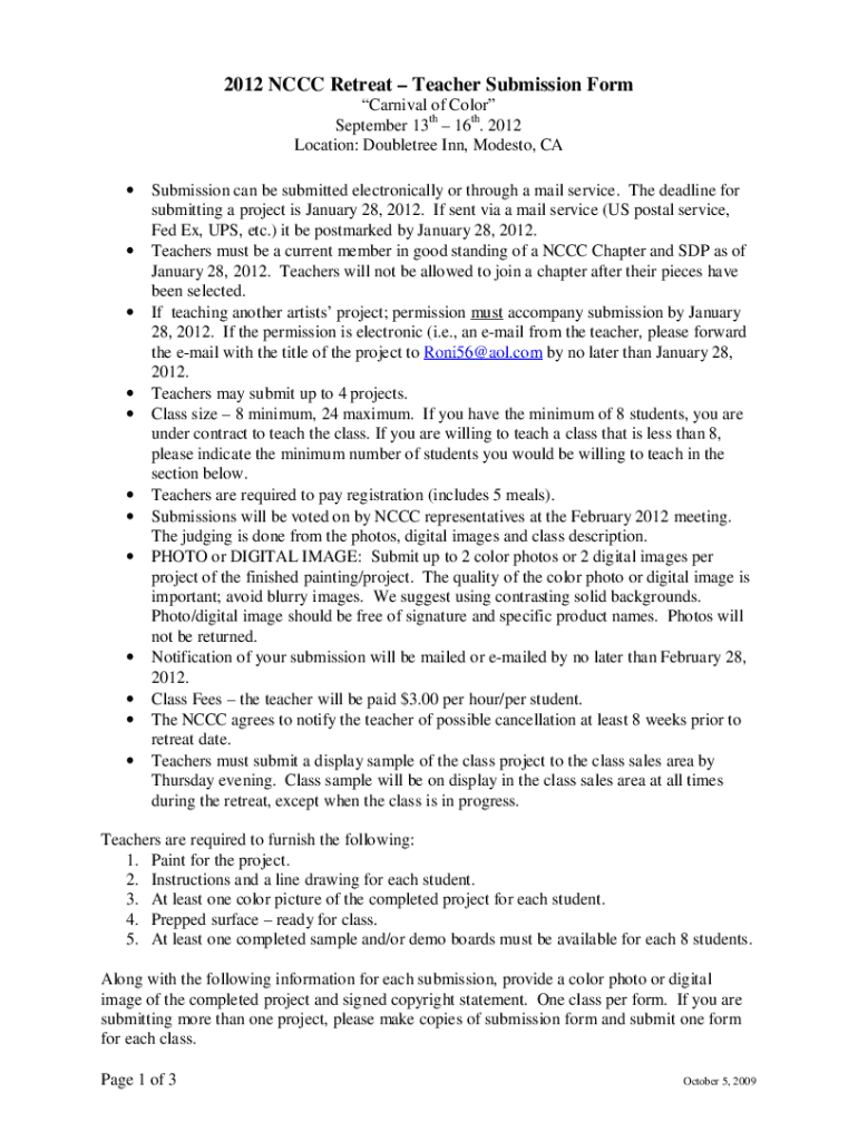 2012 CCC Retreat Teacher Submission Form Carnival of Color September 13th 16th. 2012 Location: Double tree Inn, Modesto, CA Submission can be submitted electronically or through a mail service. The