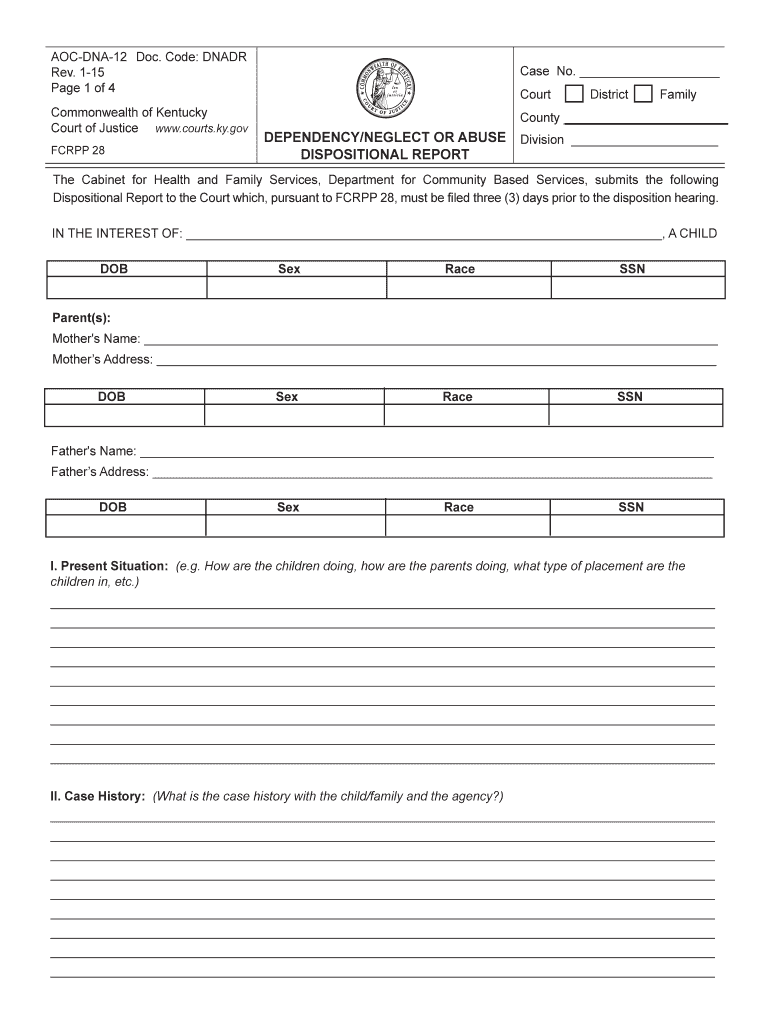 The Kentucky Dispositional Report Form is a legal document used by social workers and courts to provide the court with detailed reports and recommendations for a child involved in dependency, neglect, or abuse cases.