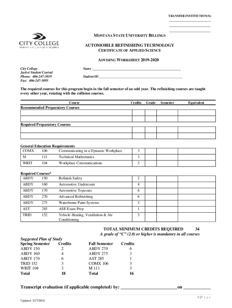 TRANSFER INSTITUTION(S): MONTANA STATE UNIVERSITY BILLINGS AUTOMOBILE REFINISHING TECHNOLOGY CERTIFICATE OF APPLIED SCIENCE ADVISING WORKSHEET 20192020 City College Jacket Student Central Phone: 4062473019