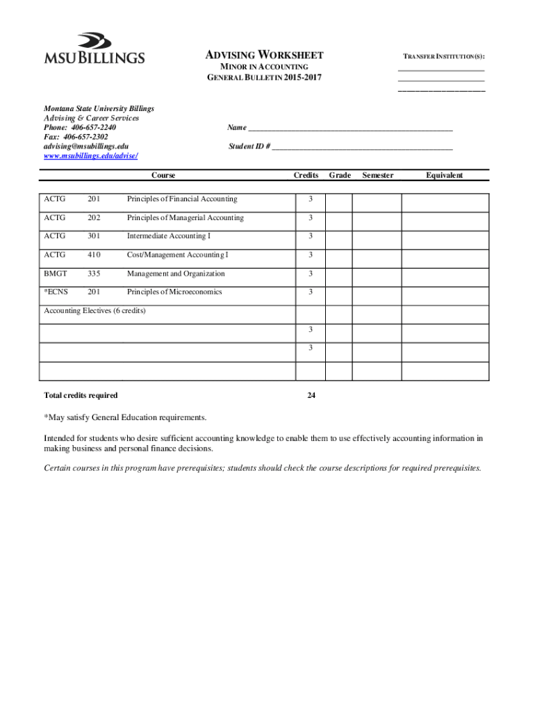 ADVISING WORKSHEETTRANSFER INSTITUTION(S):MINOR IN ACCOUNTING GENERAL BULLETIN 20152017 Montana State University Billings Advising & Career Services Phone: 4066572240 Fax: 4066572302 advising shillings.edu