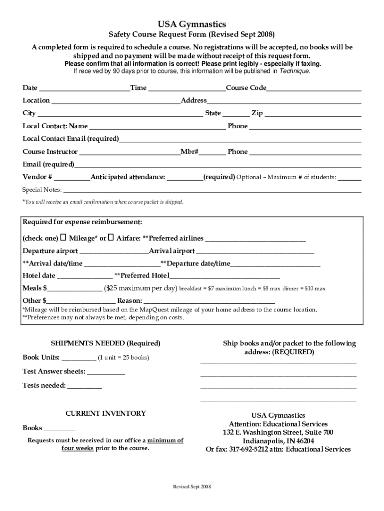 USA Gymnastics Safety Course Request Form (Revised Sept 2008) A completed form is required to schedule a course. No registrations will be accepted, no books will be shipped and no payment will be