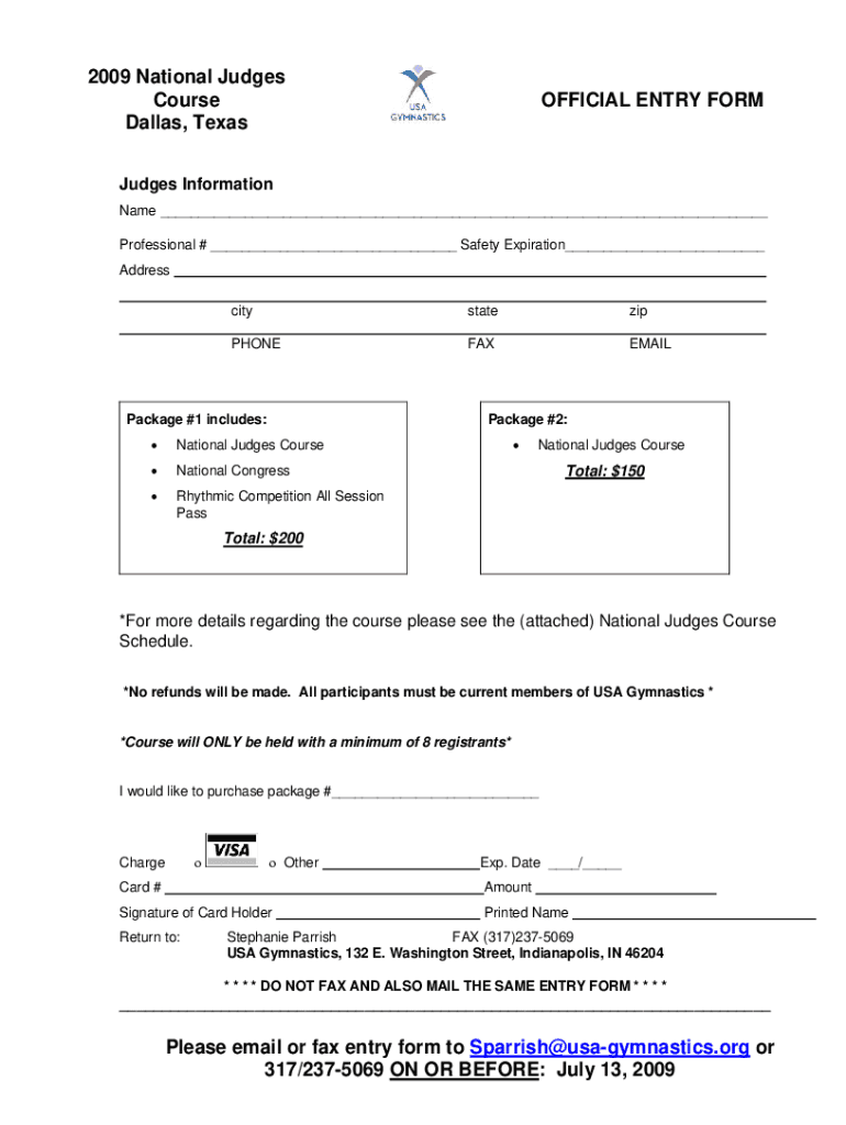 2009 National Judges Course Dallas, TexasOFFICIAL ENTRY FORM Judges Information Name Professional # Safety Expiration Address citystatezipPHONEFAXEMAILPackage #1 includes:Package #2:National Judges