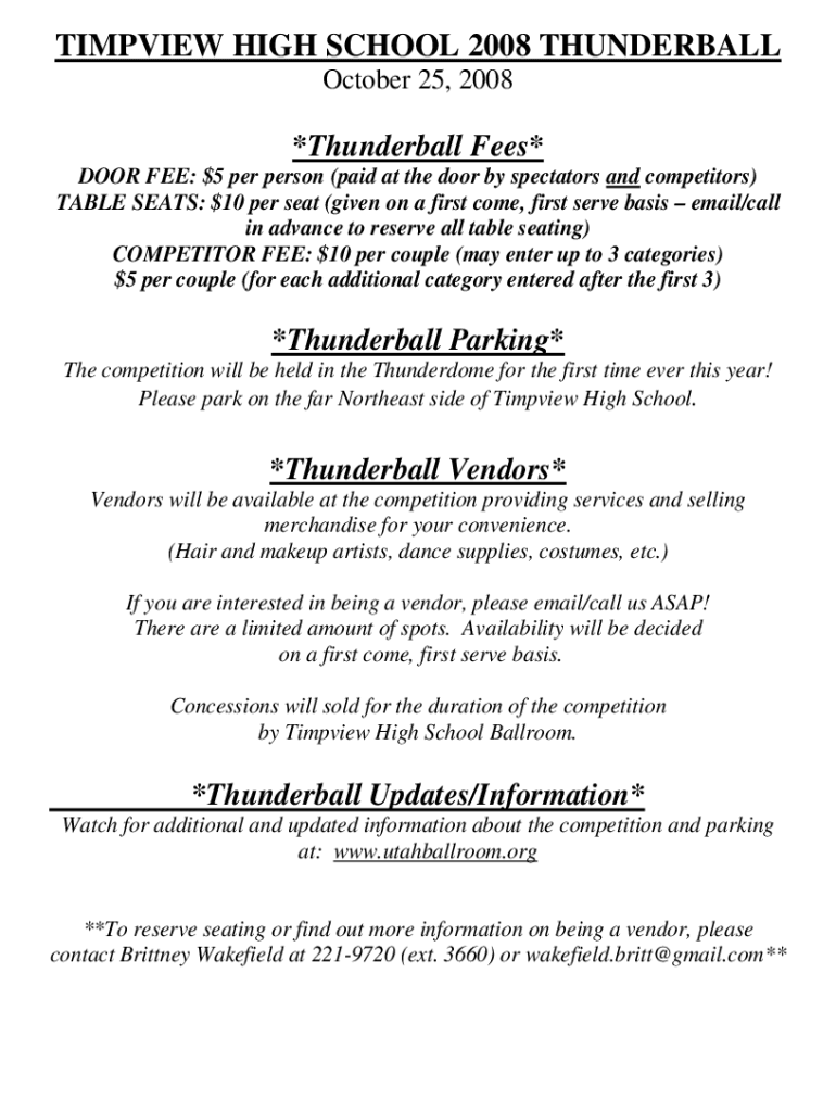 IMPLIED HIGH SCHOOL 2008 THUNDERBOLT October 25, 2008×Thunder ball Fees* DOOR FEE: $5 per person (paid at the door by spectators and competitors) TABLE SEATS: $10 per seat (given on a first come,