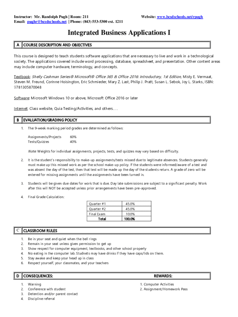 Instructor: Mr. Randolph Pugh Room: 211 Email: puff bcsdschools.net Phone: (843) 5535300 ext. 1211Website: www.bcsdschools.net/rpughIntegrated Business Applications I COURSE DESCRIPTION AND OBJECTIVESThis