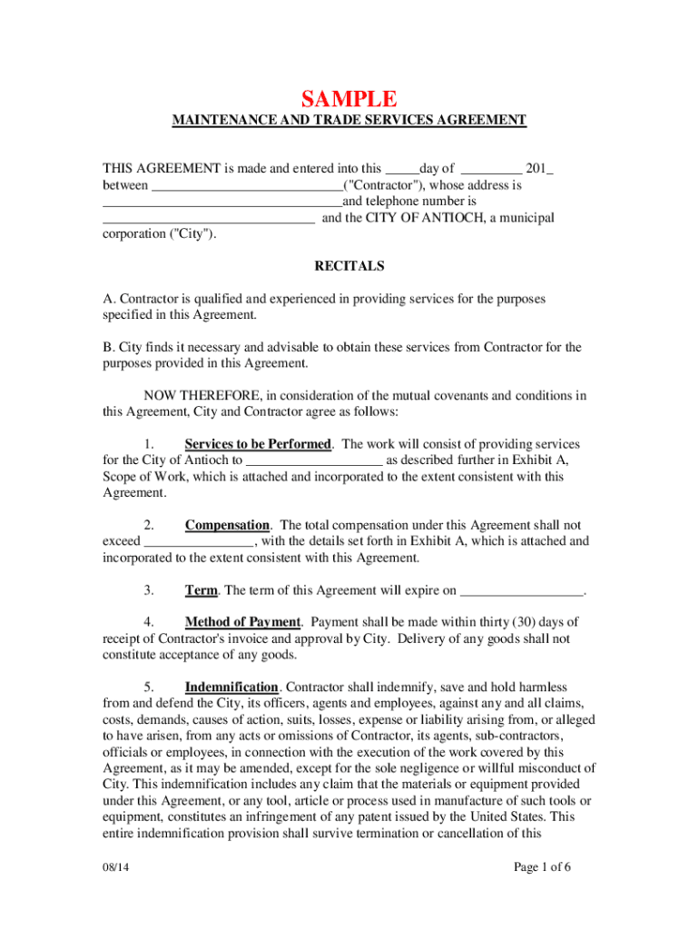 SAMPLE MAINTENANCE AND TRADE SERVICES AGREEMENTS AGREEMENT is made and entered into this day of 201 between (“Contractor “), whose address is and telephone number is and the CITY OF ANTIOCH, a