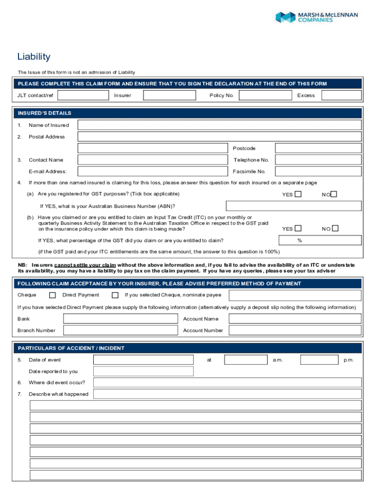 The Issue of this form is not an admission of LiabilityPLEASE COMPLETE THIS CLAIM FORM AND ENSURE THAT YOU SIGN THE DECLARATION AT THE END OF THIS FORM