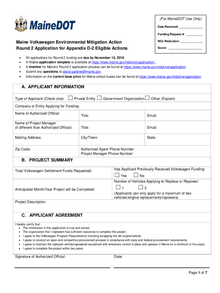 (For Maine DOT Use Only) Date Received: Funding Request #: NOX Reduction: Maine Volkswagen Environmental Mitigation Action Round 2 Application for Appendix D2 Eligible ActionsScore: All applications