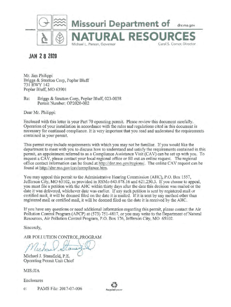 DNR.mo.govern 2 8 2020 Mr. Jim Philippe Briggs & Stratton Corp, Poplar Bluff 731 HWY 142 Poplar Bluff, MO 63901 Re:Briggs & Stratton Corp, Poplar Bluff, 0230038 Permit Number: OP2020002Dear Mr. Philippe: