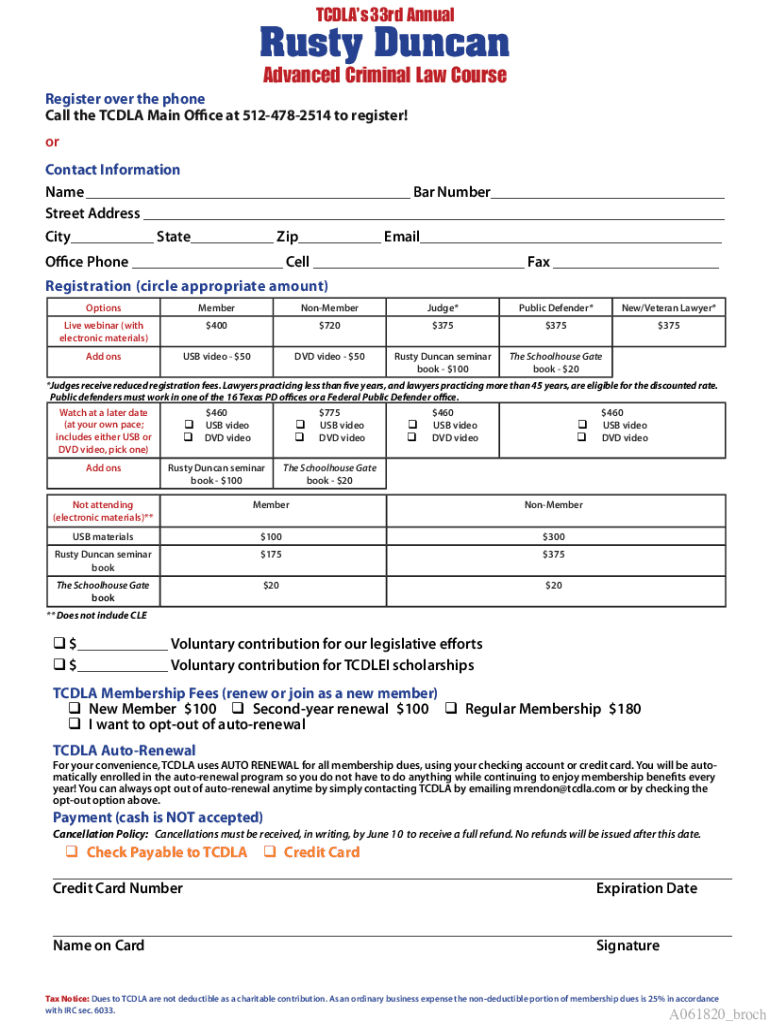 TCAS 33rd Annual Rusty Duncan Advanced Criminal Law CourseRegister over the phone Call the TC DLA Main Office at 5124782514 to register! Or Contact Information Name Bar Number Street Address City