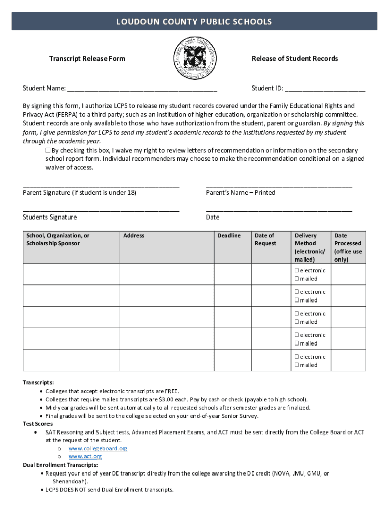 LOUDOUN COUNTY PUBLIC SCHOOLSTranscript Release Prerelease of Student RecordsStudent Name: Student ID: By signing this form, I authorize LAPS to release my student records covered under the Family