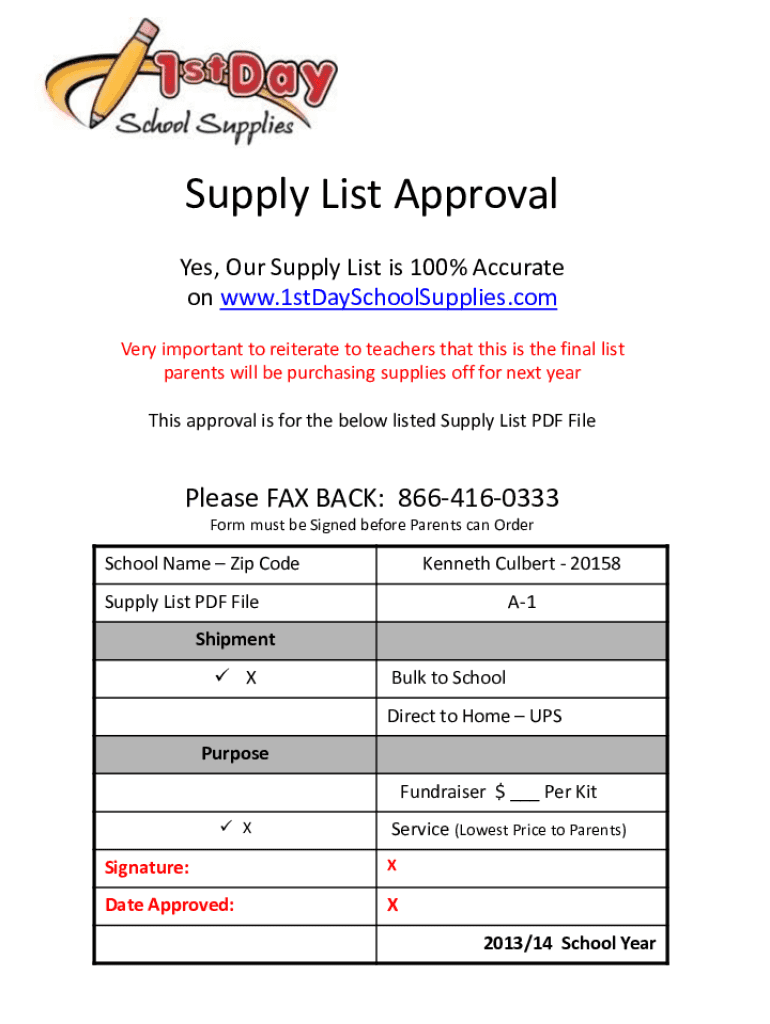 Supply List Approval Yes, Our Supply List is 100% Accurate on www.1stDaySchoolSupplies.com Very important to reiterate to teachers that this is the final list parents will be purchasing supplies off