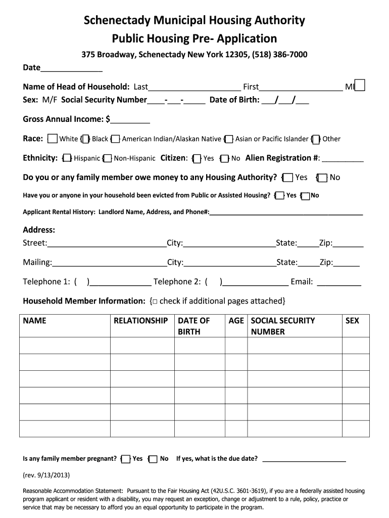 Schenectady Municipal Housing Authority Public Housing PRE Application 375 Broadway, Schenectady New York 12305, (518) 3867000 Date Name of Head of Household: Last First MI Sex: M/F Social Security