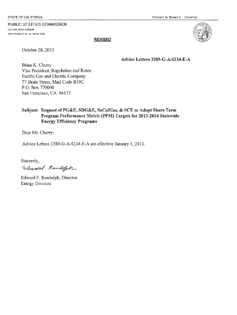 Brian K. Cherry-pick President Regulatory Relations October 11, 2013Pacific Gas and Electric Company 77 Beale St., Mail Code B10C P.O. Box 770000 San Francisco, CA 94177 Fax: 415.973.7226Advice 3389GA/4234EA(Pacific