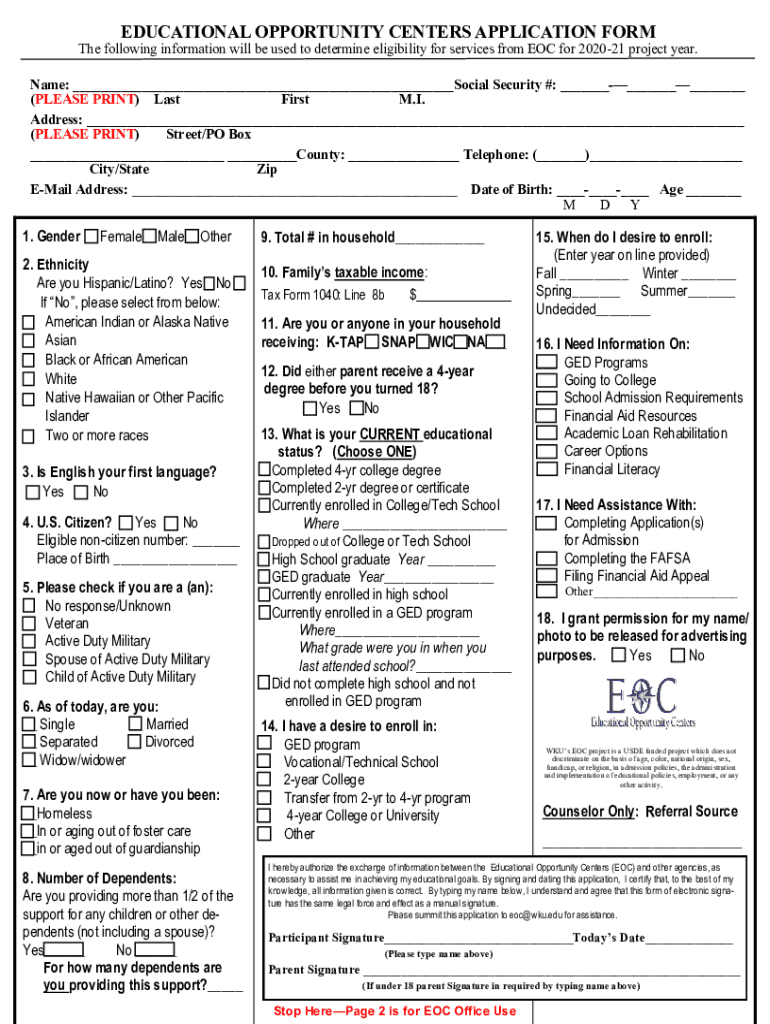EDUCATIONAL OPPORTUNITY CENTERS APPLICATION Forth following information will be used to determine eligibility for services from EOC for 202021 project year. Name: Social Security #: (PLEASE PRINT)
