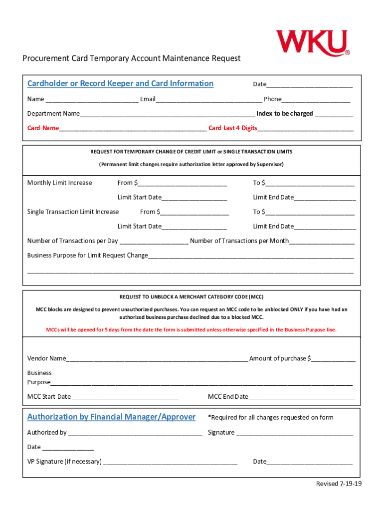 Procurement Card Temporary Account Maintenance Request Cardholder or Record Keeper and Card Informational Name Email Phone Department Name Index to be charged Card Name Card Last 4 Digits REQUEST