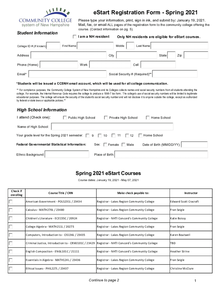 Get the free eStart Registration Form - Spring 2021 - ccsnh.edu