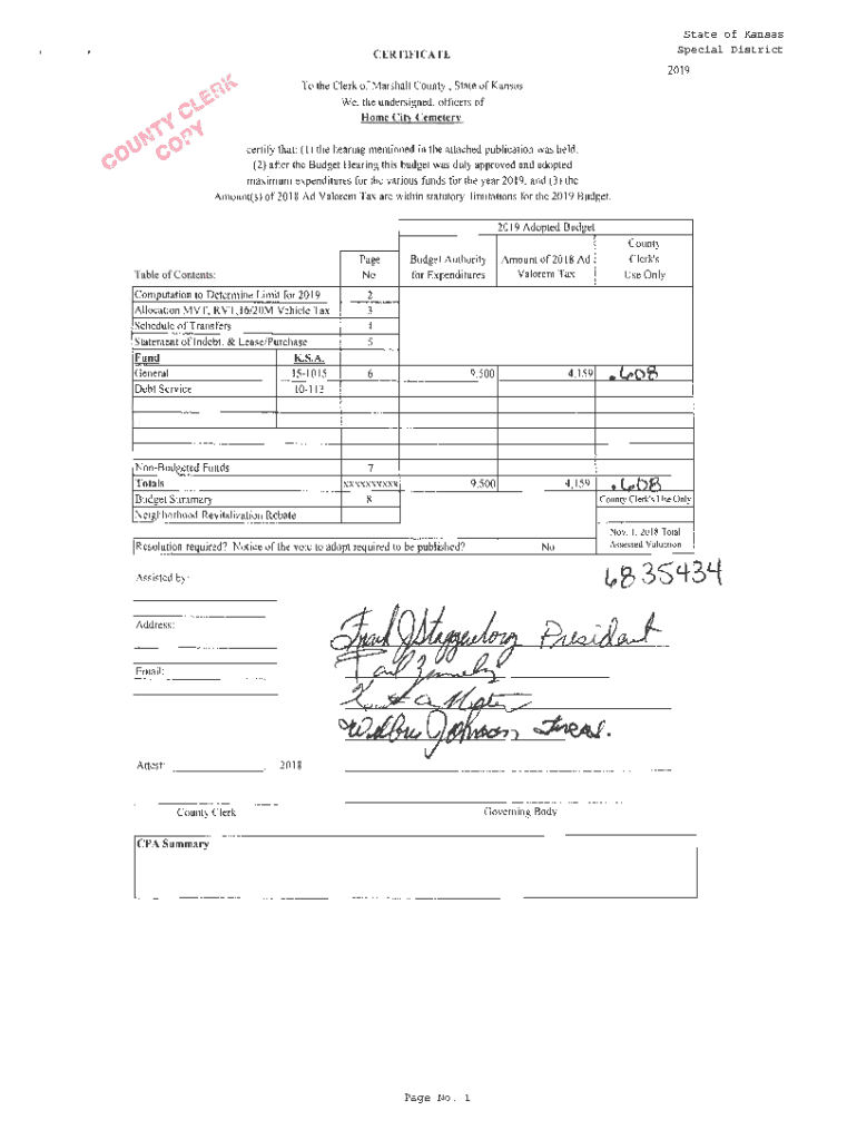 Get the free State of Kansas CERTIFICATE Special Dist r ict 20 19 To the ...