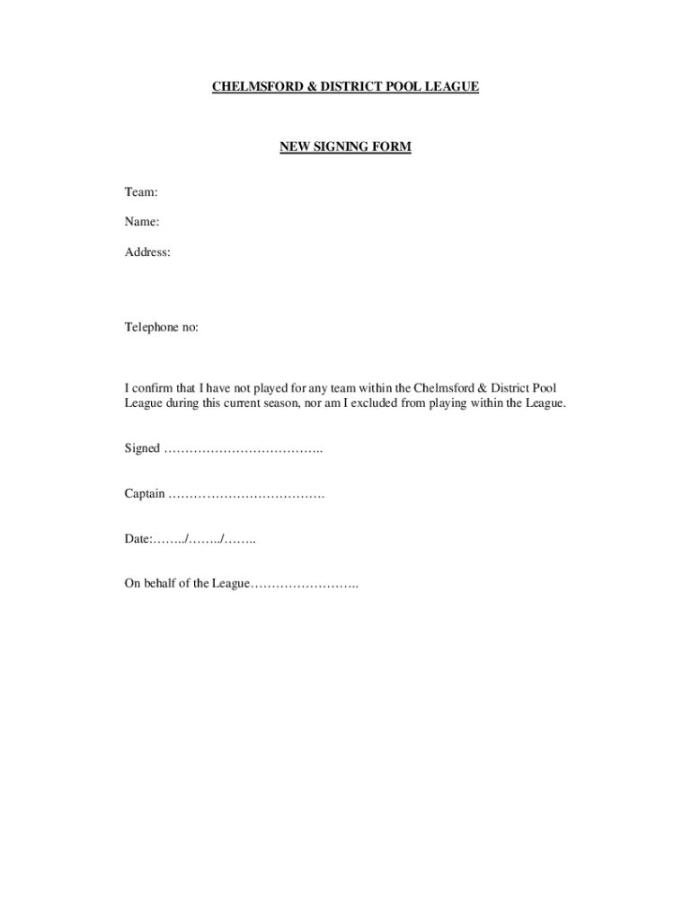 CHELMSFORD & DISTRICT POOL LEAGUE SIGNING Former: Name: Address:Telephone no:I confirm that I have not played for any team within the Chelmsford & District Pool League during this current season,