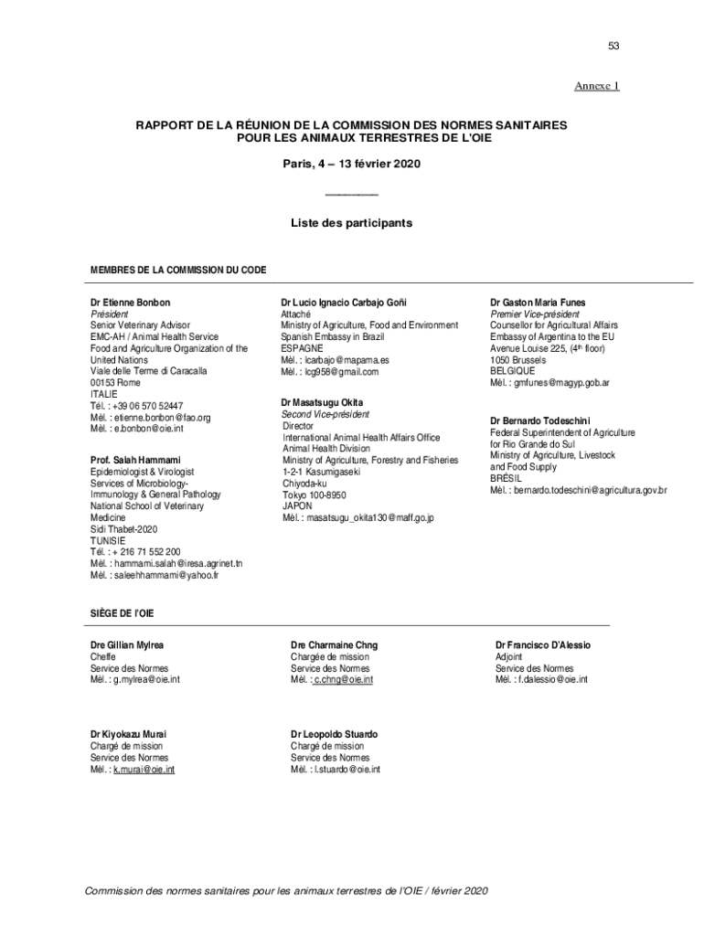 53Annexe 1RAPPORT DE LAR UNION DE LA COMMISSION DES NORMS SOLITAIRES POUR LES ANIMA UX TERRESTRIAL DE L 'ONE Paris, 4 13 frier 2020 List DES participantsMEMBRES DE LA COMMISSION DU CODE Dr Étienne