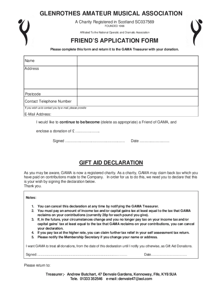 GLENROTHES AMATEUR MUSICAL ASSOCIATION A Charity Registered in Scotland SC037569 FOUNDED 1966 Affiliated To the National Operatic and Dramatic AssociationFRIENDS APPLICATION FORM Please complete this