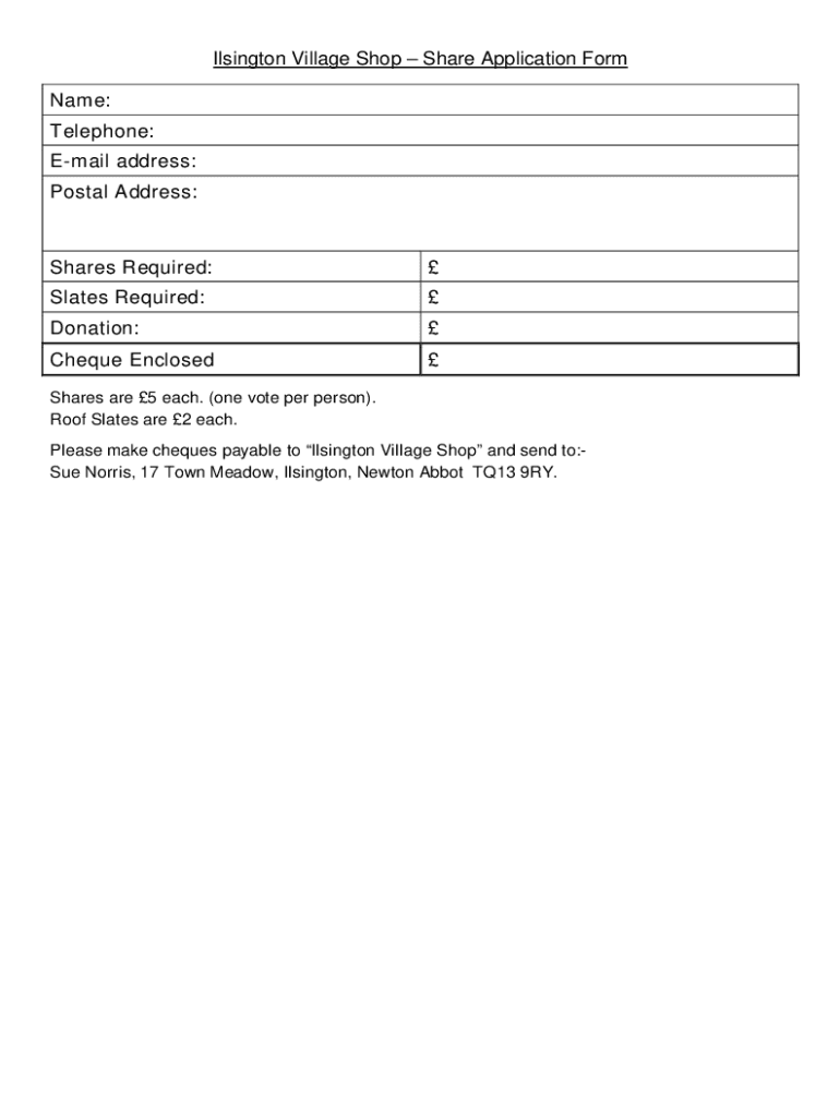 Wilmington Village Shop Share Application Form Name: Telephone: Email address: Postal Address:Shares Required:Slates Required:Donation:Check EnclosedShares are 5 each. (one vote per person). Roof