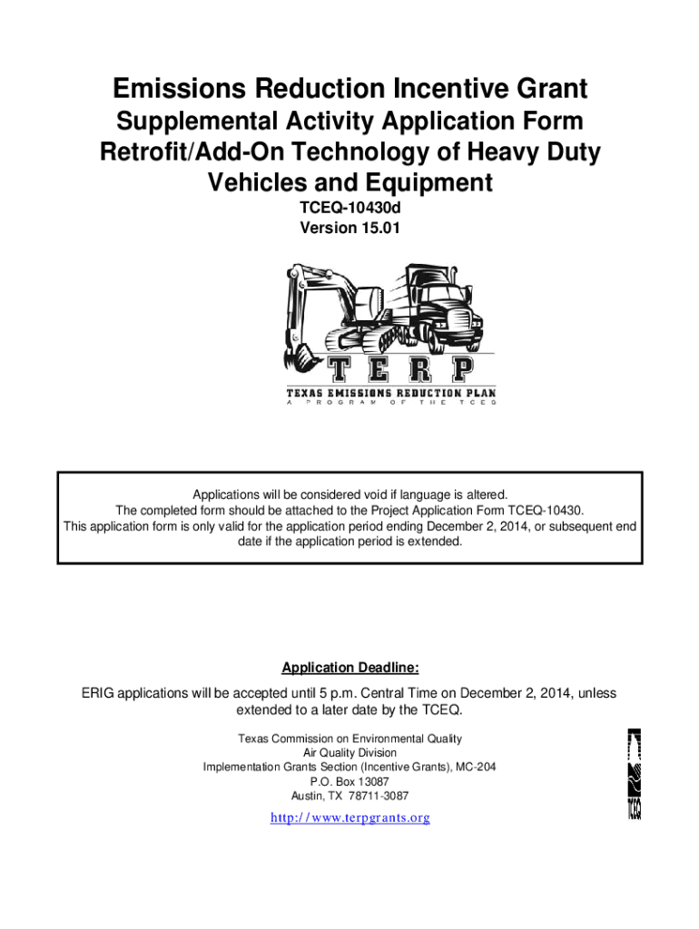 Press UP or DOWN ARROW in column A to read through the documentEmissions Reduction Incentive GrantSupplemental Activity Application FormRetrofit/Andon Technology of Heavy DutyVehicles and EquipmentTCEQ10430dVersion