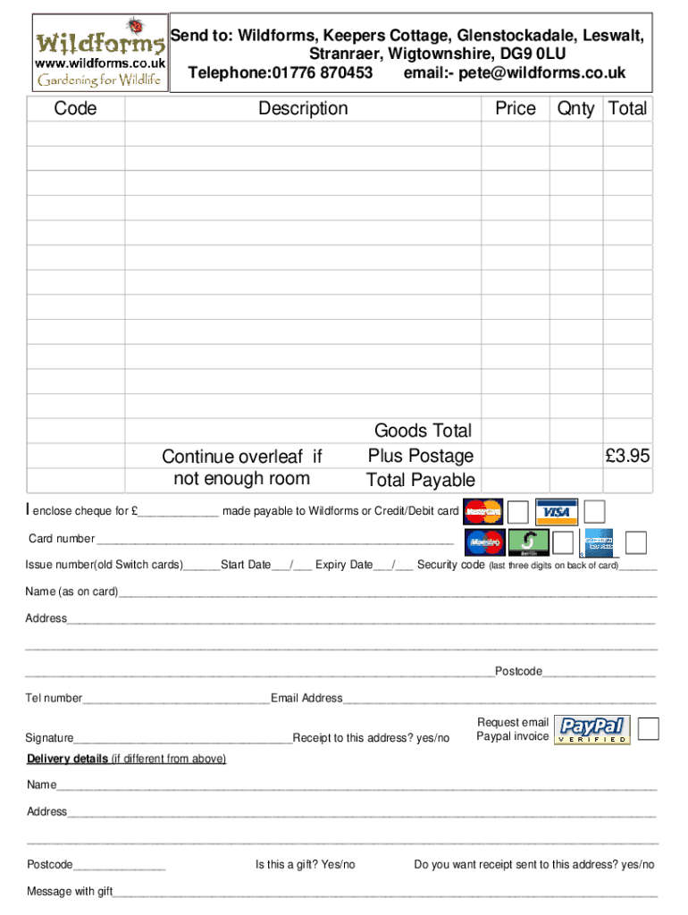 Send to: Wild forms, Keepers Cottage, Glenstockadale, Gestalt, Stranger, Wigtownshire, DG9 0LU Telephone:01776 870453 email: Pete wild forms.co.ukCodeDescriptionContinue overleaf if not enough roomPriceGoods
