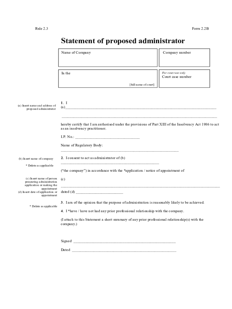 Rule 2.3Form 2.2BStatement of proposed administrator Name of CompanyCompany number court use only In court case number full name of court (a) Insert name and address of proposed administrator1. I