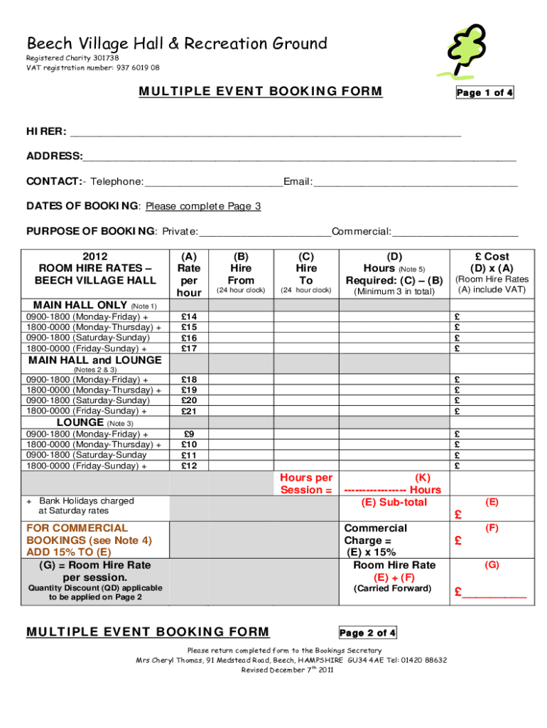 Beech Village Hall & Recreation Ground Registered Charity 301738 VAT registration number: 937 6019 08MULTIPLE EVENT BOOKING FORM Page 1 of 4HIRER: ADDRESS: CONTACT: Telephone: Email: DATES OF BOOKING: